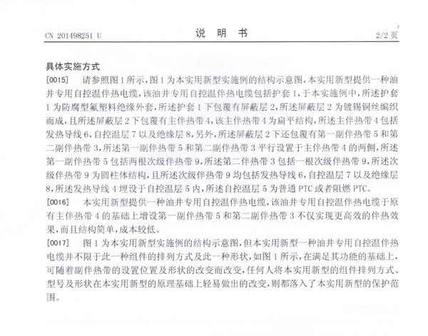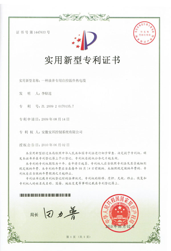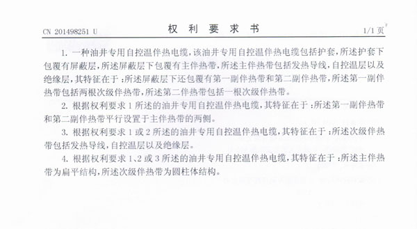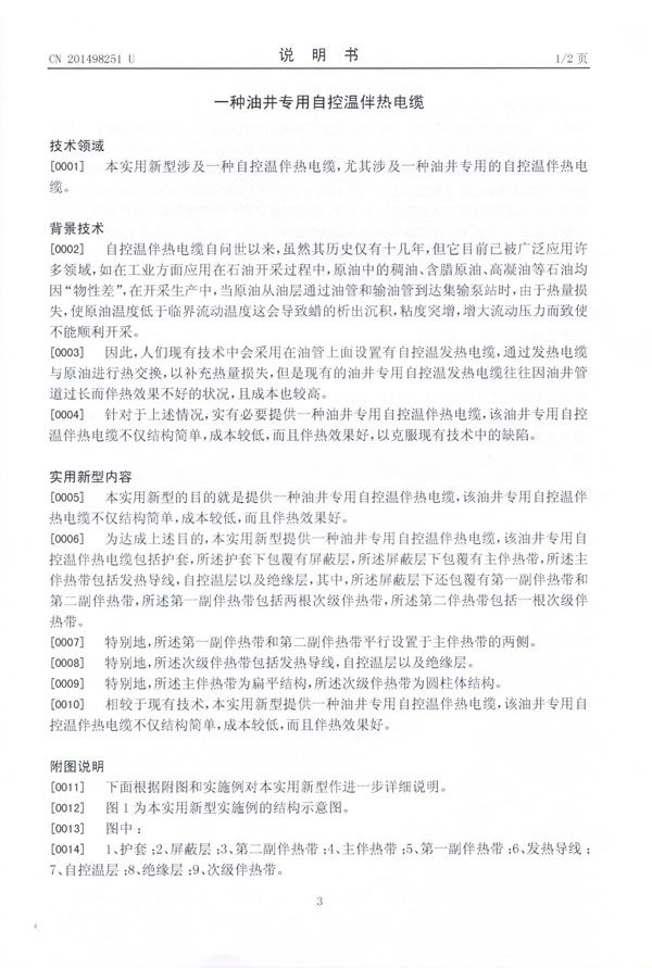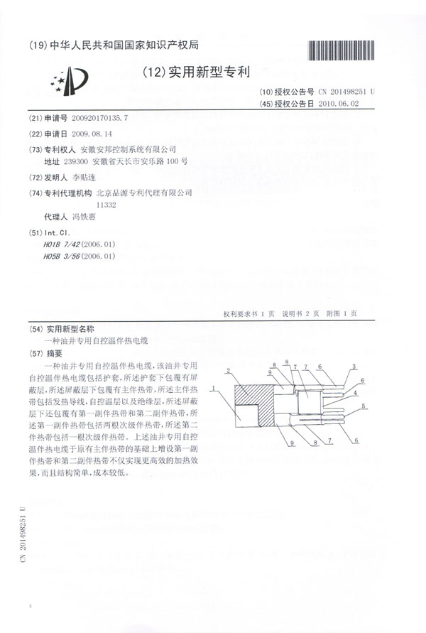 油井专用自控温伴热电缆实用新型专利证书