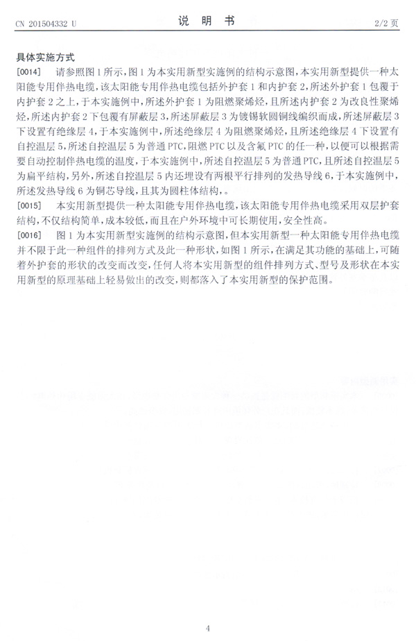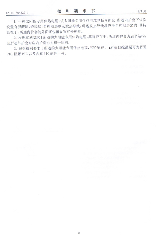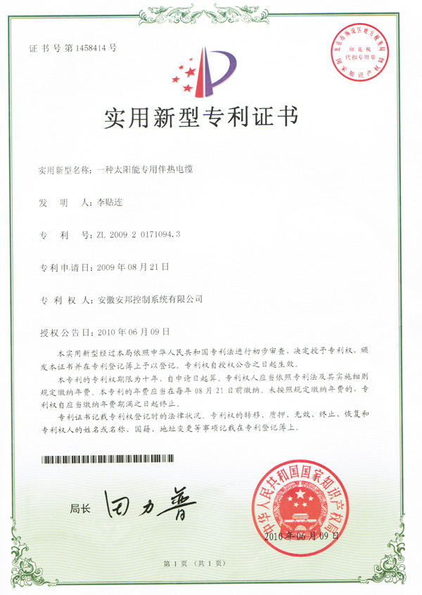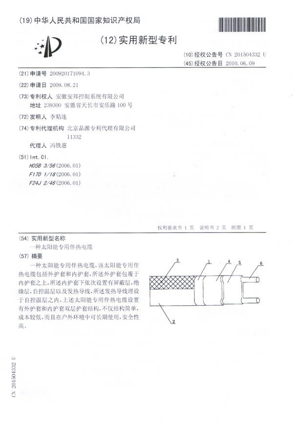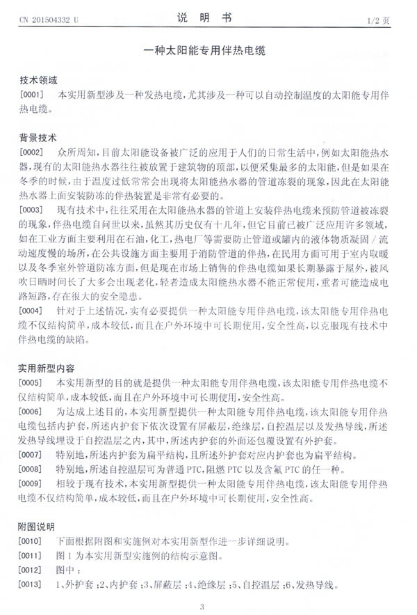 太阳能专用电伴热带实用新型专利证书