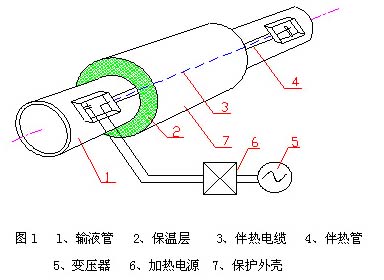 管道集肤效应伴热技术装置,基本上由变压器、加热电源、输液管、伴热管和伴热电缆、保温层、保护外壳等部分组成。加热电源分工频和中频加热电源两种;输液管和伴热管为普通钢管,伴热管直径为15-40mm,间断的焊接在输液管上;伴热电缆穿在伴热管中,外面是保温层和保护外壳。